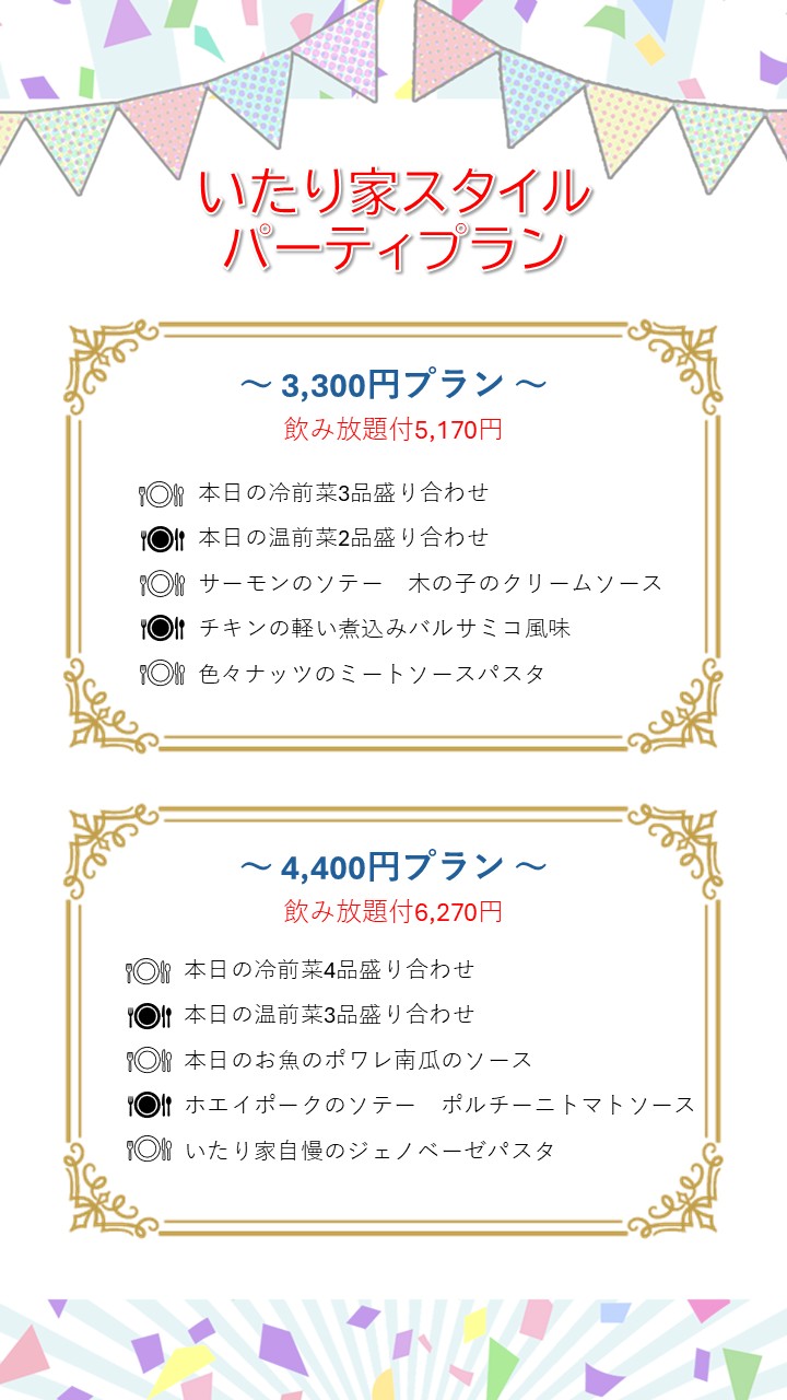 パーティーメニュー 2025.07.012025.10.21 いたり家で楽しい飲み会しよ! お料理やお飲み物のついてのご相談はお気軽にスタッフにお声かけください。スタッフ一同ご予約お待ちしております。お問い合わせは各店舗にお願い致します。